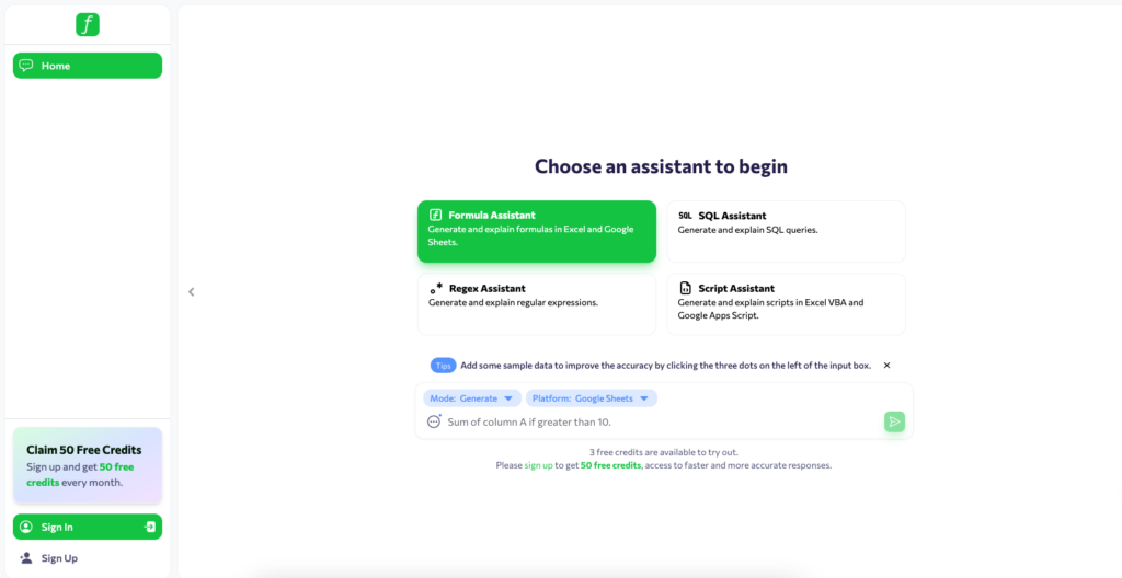 With its minimalistic, beginner-friendly UI and smart assistants tailored for each use case, Formularizer is your go-to digital helper for Excel, Google Sheets, SQL databases, and beyond.